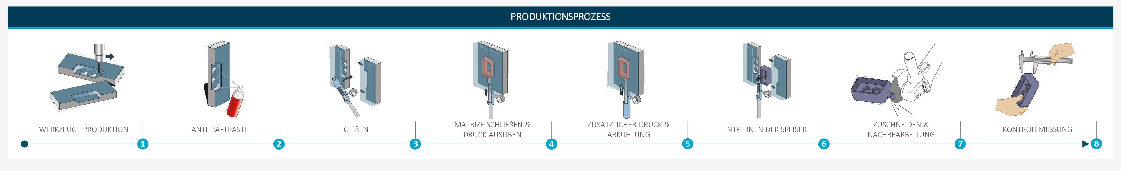 - Häufig verwendete Legierungen: A356, A356.2, A357, AlSi9Mg, AlSi9Cu3, 319S, ZL104, Al-Ti-Legierung